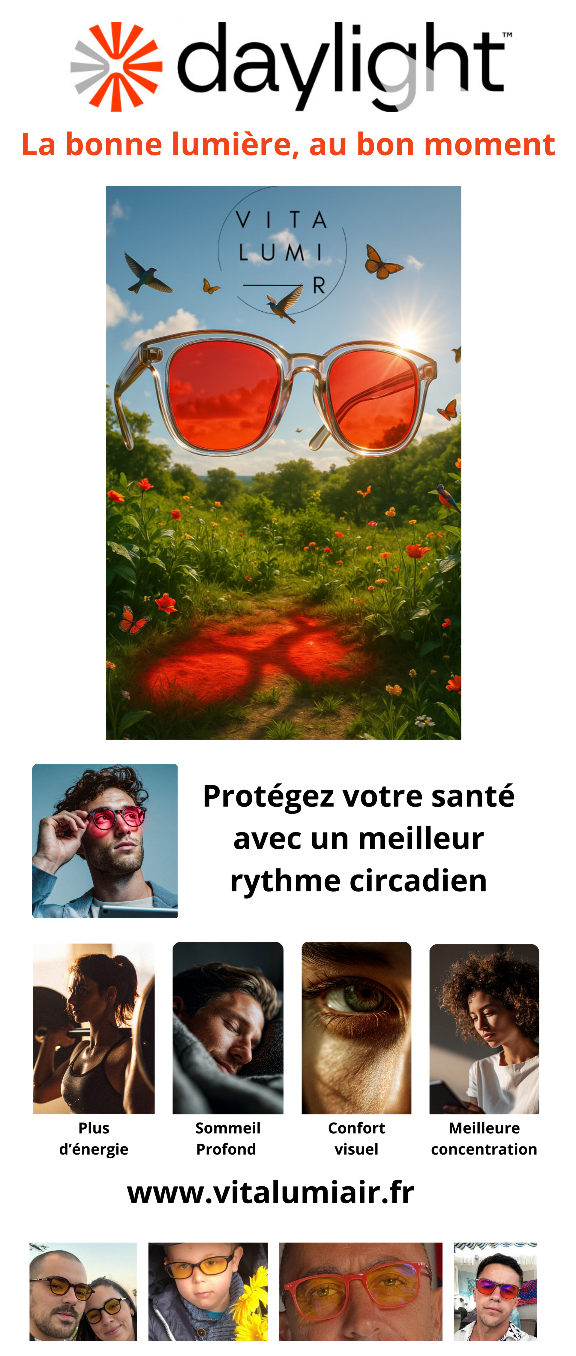 Vous êtes sur le point d'améliorer votre santé naturellement. Utilisez les lunettes Daylight et découvrez comment une lumière adaptée transforme notre bien-être (correction visuelle sur ordonnance est bientôt disponible en option).